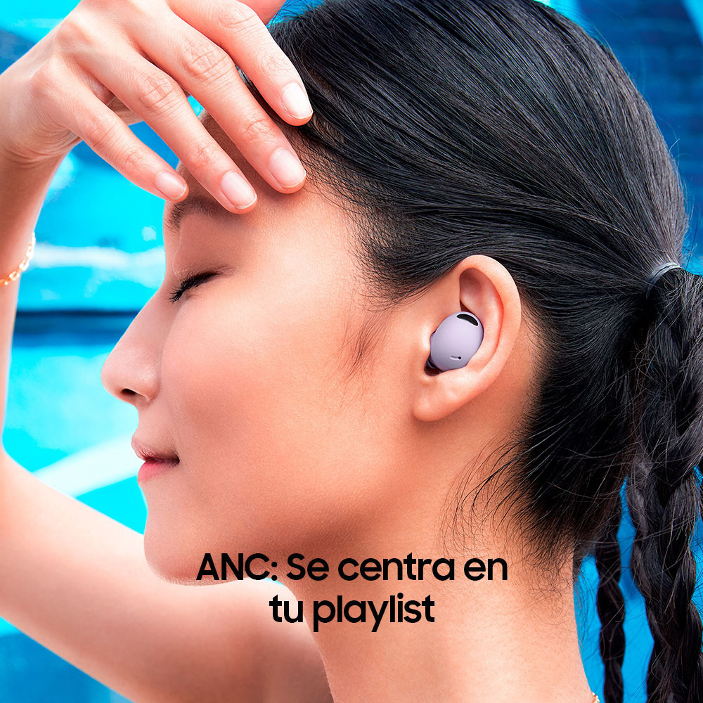Descubre los últimos Galaxy Buds2 Pro. Descubre los auriculares inalámbricos inteligentes de Samsung que se adaptan a todo lo que hagas. Descubre su diseño único y mejorado, aún más cómodo que no se caerán de tus orejas, una calidad de audio superior e inteligente que mejora el sonido de tus contenidos, además podrás disfrutar de una experiencia en perfecta sincronía con todos tus dispositivos. Lo primero que debes saber es que los nuevos Galaxy Buds2 Pro son un 15% más pequeños que la generación anterior, por lo que son todavía más cómodos al uso y de llevar. Se ajustan perfectamente a tu oreja gracias a sus 3 tamaños de almohadillas que podrás ajustar desde el primer segundo. Además, su diseño ergonómico evita que se muevan demasiado en tu oreja, por lo que podrías realizar cualquier actividad escuchando tu contenido favorito. También cuentan con un nuevo diseño Premium y elegante que hará match con tus dispositivos Galaxy. Disfruta de una calidad de audio avanzada Hi-Fi de 24 bits, con 256 veces más datos de sonido que unos auriculares convencionales de solo 16 bits. Este tipo tecnología te permite escuchar tu contenido con una resolución de música cercana a la calidad de estudio. También cuenta con un procesamiento de sonido mejor que minimiza la pérdida de calidad y sonidos de una pista. En resumidas cuentas, escucharás tu música y series con la mejor calidad de audio sin distorsión. Sumérgete en tus contenidos en todo momento con la mejor calidad y sin ruido. Los nuevos Galaxy Buds2 Pro cuentan con una cancelación activa de ruido todavía más potente, por lo que eliminarán cualquier sonido molesto del ambiente de manera más eficiente, incluso ruidos casi imperceptibles o el sonido del viento. Descubre una manera de hablar más inteligente con el avanzado detector de voz de los nuevos Galaxy Buds2 Pro, que, cuando hablas, cambia automáticamente la cancelación activa de ruido por el modo conversación, poniendo todo el foco de sus micrófonos en ti.