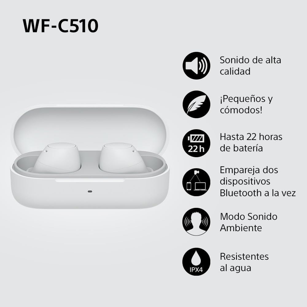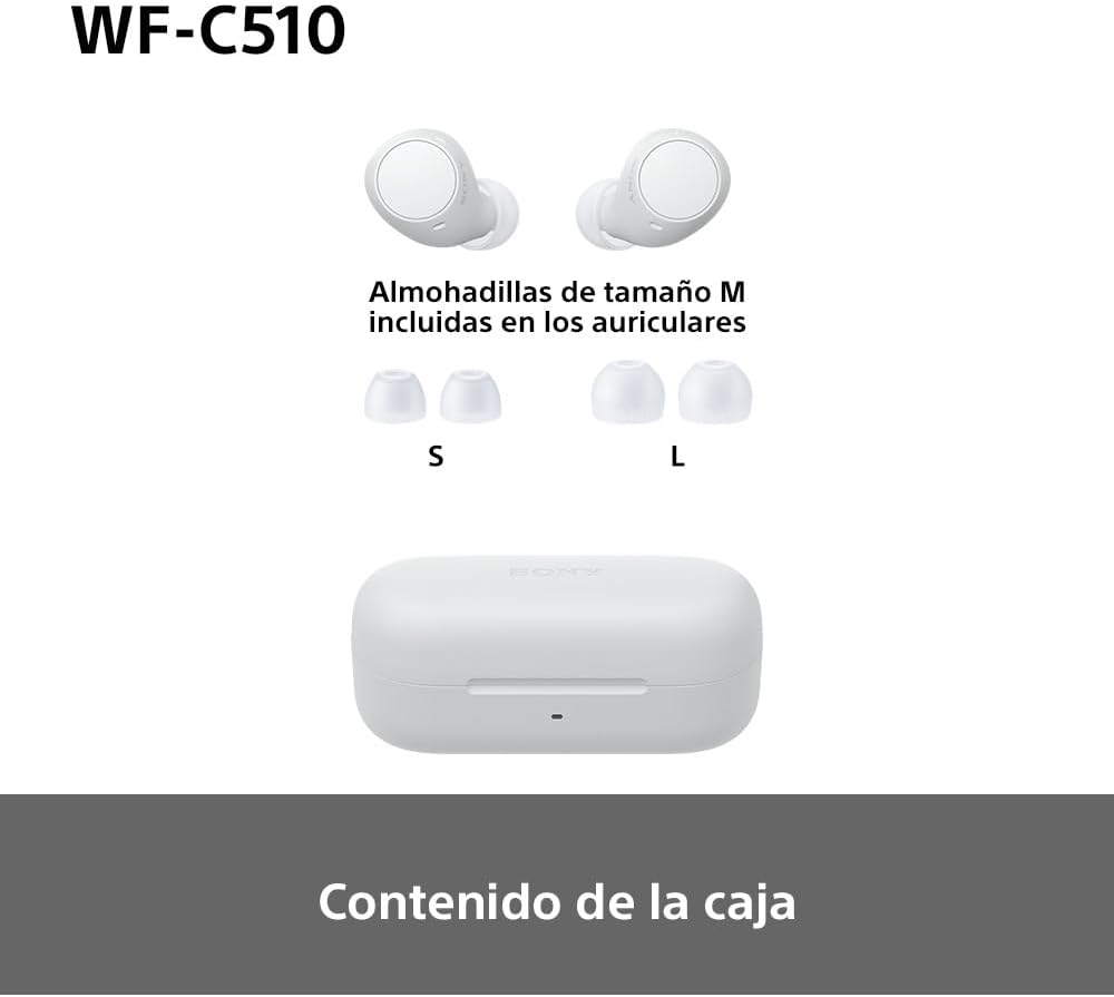 Sony WF-C510. Tipo de producto: Auriculares. Tecnología de conectividad: True Wireless Stereo (TWS), Bluetooth. Uso recomendado: Llamadas/Música/Deporte/Uso diario. Alcance inalámbrico: 10 m. Peso: 31 g. Color del producto: Blanco