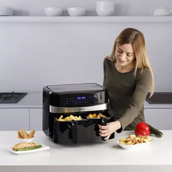 Air Fry Digital Duo utiliza aire caliente para cocinar tus alimentos, por lo que es una opción más saludable que las freidoras tradicionales. Pantalla táctil digital, dos cestas de 4,5 litros, Sync-Finish, 12 programas, 14 funciones, temporizador, 2.200-2.600W, Negra.