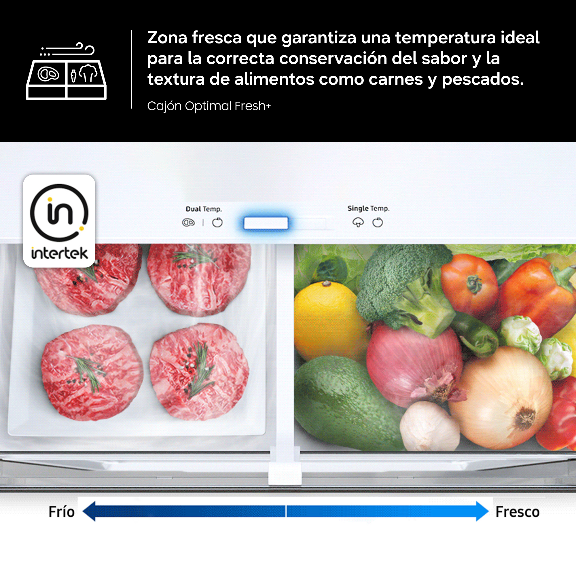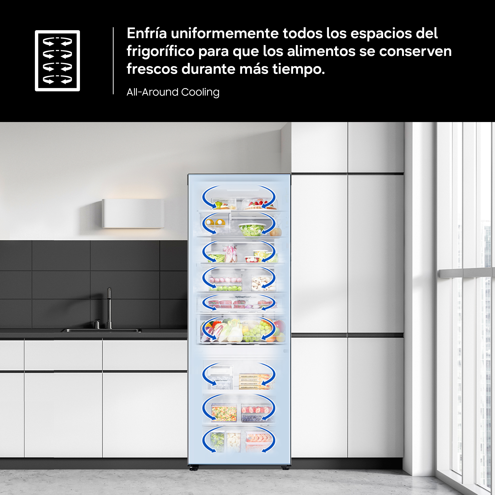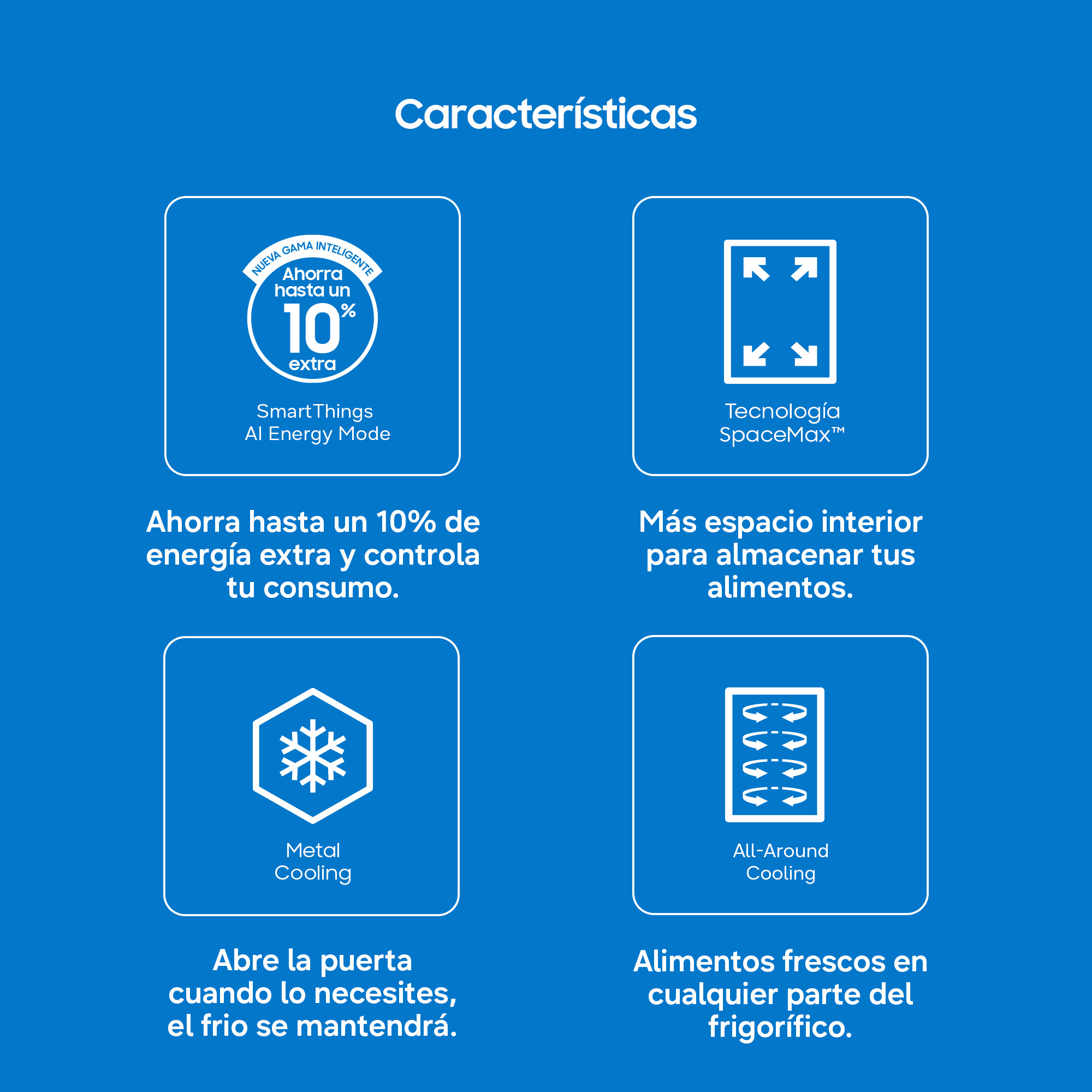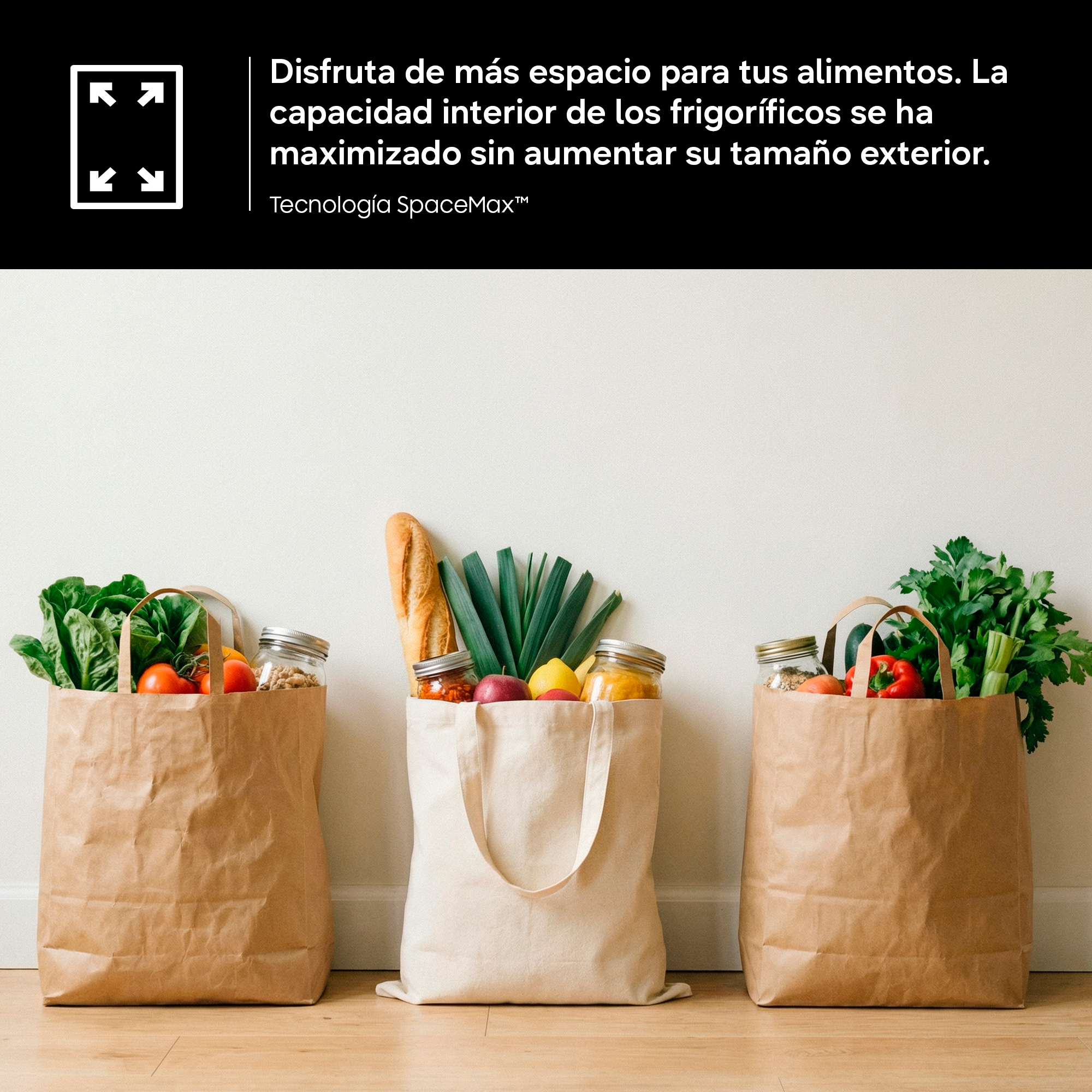 Tecnología SpaceMax: mas capacidad en el espacio reduciendo el grosor de las paredes, 344 litros de capacidad. All-Around Cooling: Cada compartimento del frigorífico se enfría por igual, de esquina a esquina, gracias al aire frío que sale por las ranuras dispuestas en cada balda. Por lo tanto, cada producto de cada estante se enfría por igual y se mantiene más fresco. Metal Cooling: Mantén fresca la comida, incluso si abres y cierras frecuentemente la puerta del frigorífico. Su fondo con recubrimiento Metal Cooling ayuda a mantener una temperatura interna óptima. Retiene el frío y previene la pérdida de aire fresco cuando la puerta está abierta. Además, restaura rápidamente cualquier pérdida de temperatura en cuanto se cierra. No Frost: No pierdas el tiempo y energía descongelando el frigorífico. La tecnología No Frost optimiza la circulación del aire para mantener una temperatura constante, evitando la acumulación de escarcha. También enfría mucho más rápido, optimizando el trabajo del sistema de refrigeración y aumentando su durabilidad. Optimal Fresh +: Disfruta de la libertad de almacenamiento. El cajón Optimal Fresh+ puede usarse como un solo cajón o separarse en dos zonas con diferentes temperaturas. El lado izquierdo está más frío, por lo que la carne y el pescado pueden mantenerse frescos el doble de tiempo Humidity Fresh +: Preserva la textura y el sabor original de la comida perecedera durante más tiempo. En este cajón puedes ajustar la humedad simplemente girando el control. Consigue el ambiente ideal para almacenar diferentes frutas y verduras para que se mantengan frescas y jugosas. Power Cool / Power Freeze: Con solo tocar un botón, la función Power Cool expulsa aire frío intensamente dentro del frigorífico para enfriar rápidamente tus alimentos o tus bebidas favoritas. Power Freeze envía una ráfaga de aire frío al congelador. Es ideal para congelar alimentos rápidamente o hacer hielo. CARACTERÍSTICAS: Clasificación energética C Capacidad útil del refrigerador 250 litros Capacidad útil del congelador 114 litros Capacidad útil total3 44 litros Tecnología All-Around Cooling Metal Cooling Optimal Fresh Humidity Fresh+ Power Cool Power Freeze No Frost Space Max Tipo de indicador Display exterior REFRIGERADOR Compartimentos en la puerta 3 Balcones Compartimentos o estantes Estantes 3 Huevera Iluminación Interior LED Numero de cajones 2 Compartimentos en la puerta 3 CONGELADOR Bandejas o estantes 3 cajones Cajones 3 Conectividad Si Observaciones Wifi Nivel de ruido 35 dB (A) Tirador Integrado Sentido de apertura de puertas A la derecha Puertas reversibles S Dimensiones 59,5 (ancho) x 185 (alto) x 65,8 (fondo) cm Peso 68 kg Consumo de energía 169 Kw/año Tensión 220 240 V