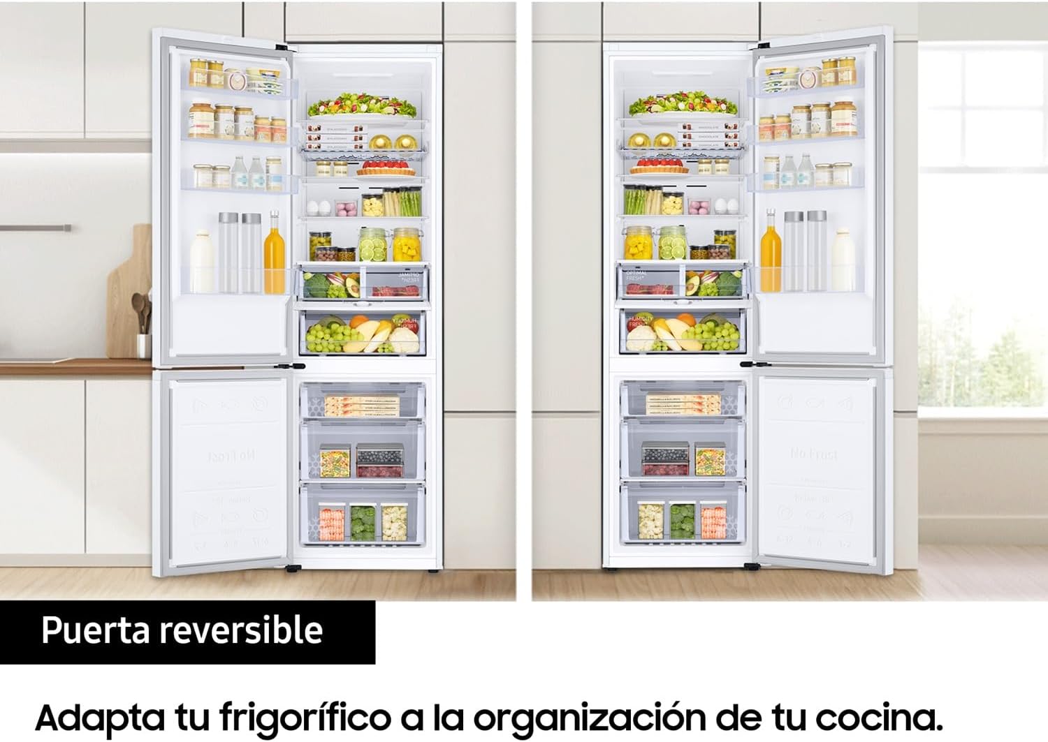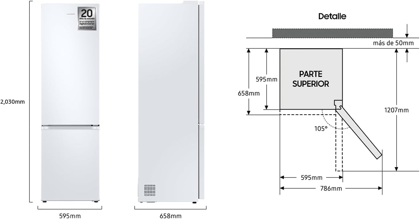 Ahorro inteligente Toma el control de tu consumo energético, reduce tu huella de carbono y ahorra dinero. SmartThings Energy te da consejos para ahorrar energía y monitoriza el consumo de tus electrodomésticos en tiempo real para compararlo con el del mes anterior. También te avisa si tus objetivos mensuales se exceden. Tecnología Space Max™ Más espacio interior manteniendo el mismo tamaño exterior. Samsung ha reducido el grosor de las paredes maximizando la capacidad interior alcanzando hasta 390 litros de capacidad neta. All-Around Cooling La temperatura se mantiene constante en cada balda gracias a que el aire frío sale por las múltiples ranuras dispuestas en cada una de ellas. Balda Botellero Hay un lugar especial para todas tus botellas dentro de este frigorífico Samsung. Con esta balda especial mantendrás tus bebidas con la refrigeración perfecta. Además, cuentan con una colocación perfecta, por lo que estarán listas para tomar y disfrutar cuando lo desees. Power Cool - Power Freeze ¿Sabías que este frigorífico Samsung cuenta con un modo turbo? Con este modo podrás hacer hielo o enfriar tu bebida de manera más veloz. Con un solo botón, el airé frío entra más rápido en el frigorífico y el congelador enfriando tus bebidas o haciendo hielo en menos tiempo. CARACTERÍSTICAS: Capacidad útil del refrigerador 276 litros Capacidad útil del congelador 114 litros Capacidad útil total 390 litros Tecnología Space Max No Frost Sistema de refrigeración All Around Cooling Humidity Control System Power Cool Compresor Digital Inverter No Frost Tipo de indicador Display interior REFRIGERADOR Tipo de bandejas o estantes 4 Compartimentos o estantes Balda botellero Iluminación Interior LED Numero de cajones 2 Compartimentos en la puerta 4 CONGELADOR Cajones 3 Conectividad Si Observaciones Wifi Nivel de ruido 35 dB Tirador Integrado Sentido de apertura de puertas A la derecha Puertas reversibles SÍ. Dimensiones 59,5 (ancho) x 203 (alto) x 65,8 (fondo) cm Consumo de energía 169 kWh/año