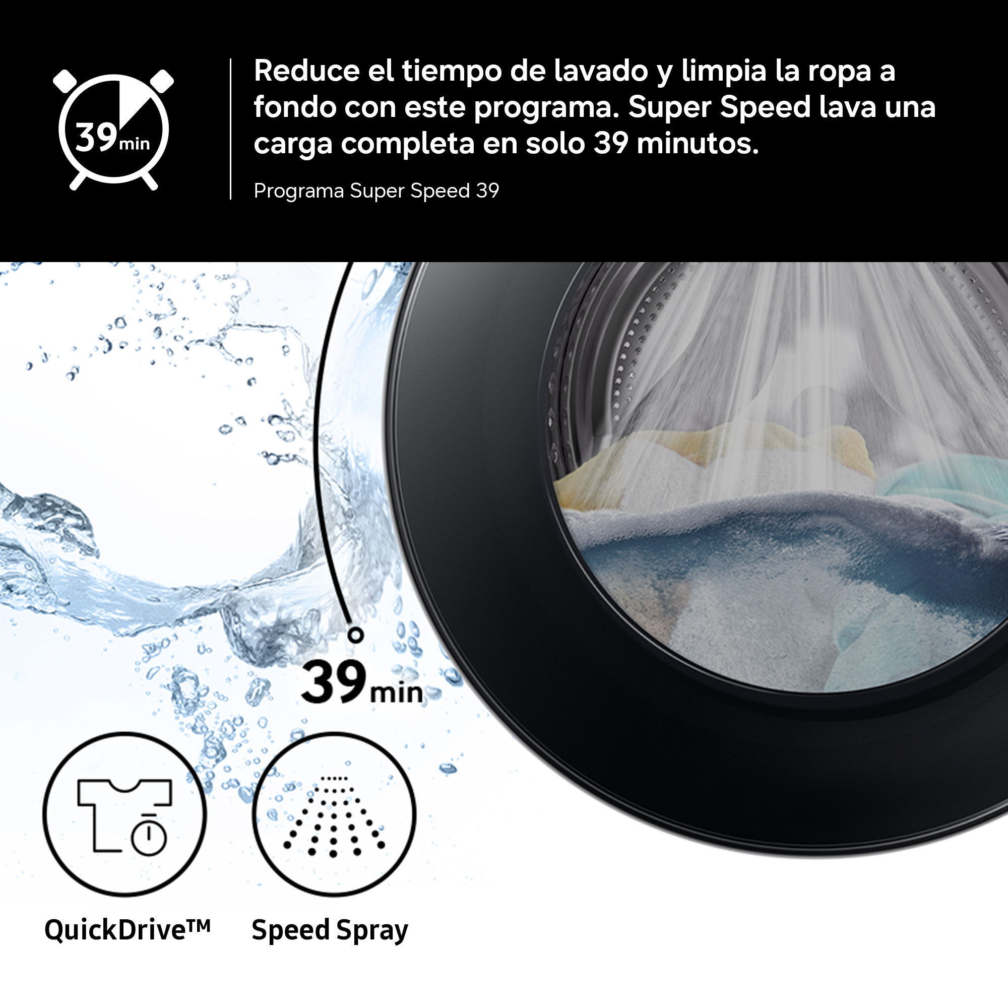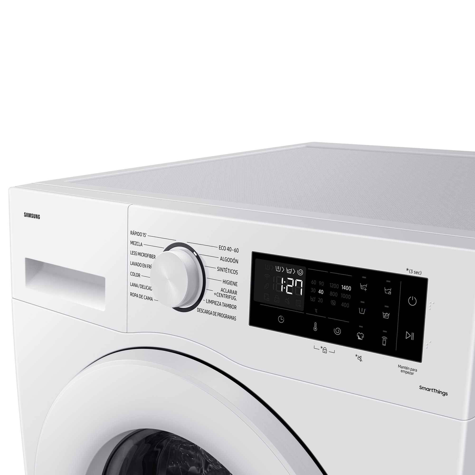 Samsung Lavadora 11kg AI Ecobubble Blanca, Clasificación Energética A WW11DG5B25AEEC. Tipo de carga: Carga frontal. Capacidad nominal: 11 kg, Clase de secado por giro: B, Nivel de ruido (spin): 72 dB, Máxima velocidad de centrifugado: 1400 RPM. Color del producto: Negro. Ancho: 600 mm, Profundidad: 600 mm, Altura: 850 mm. Clase de eficiencia de energía: A
