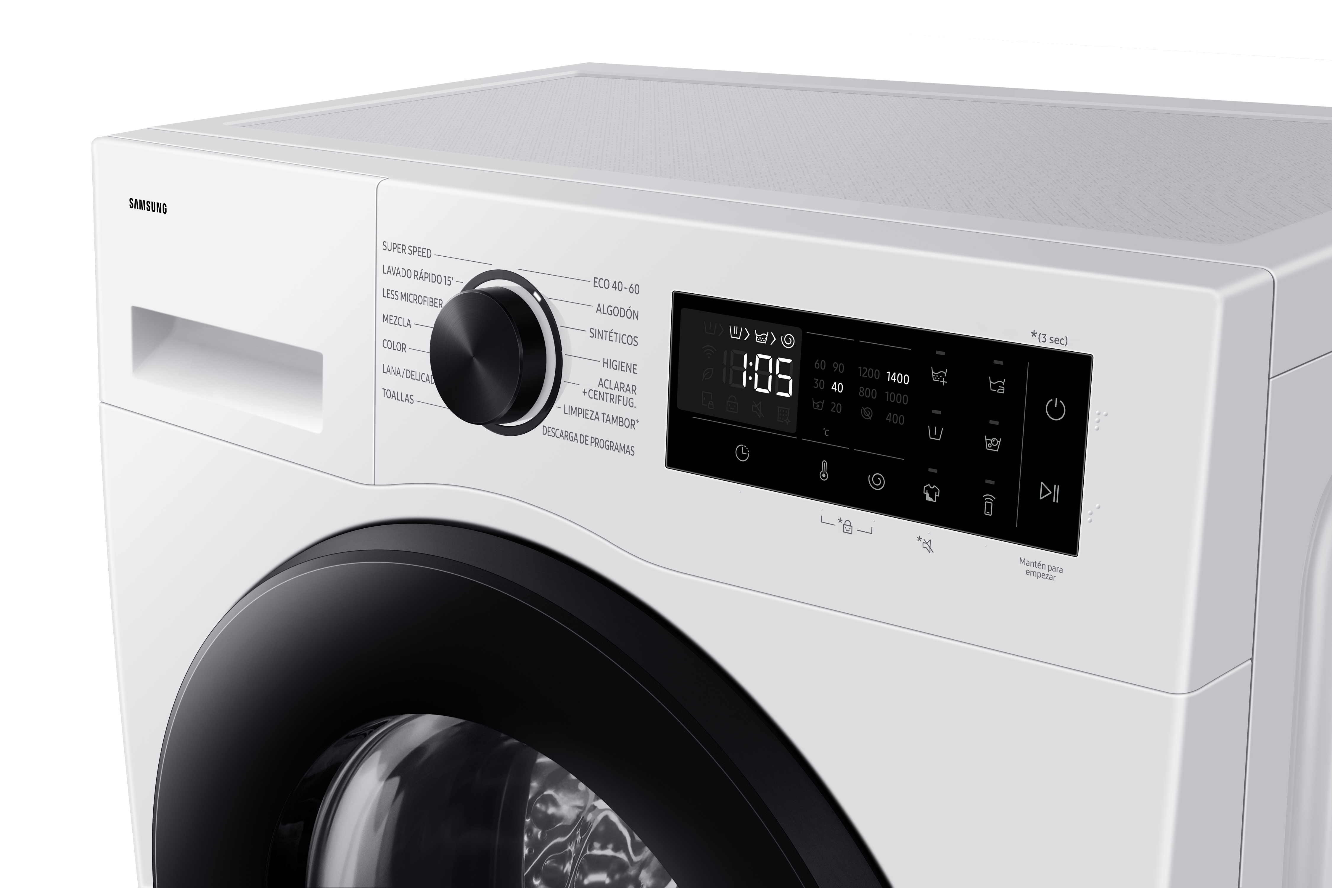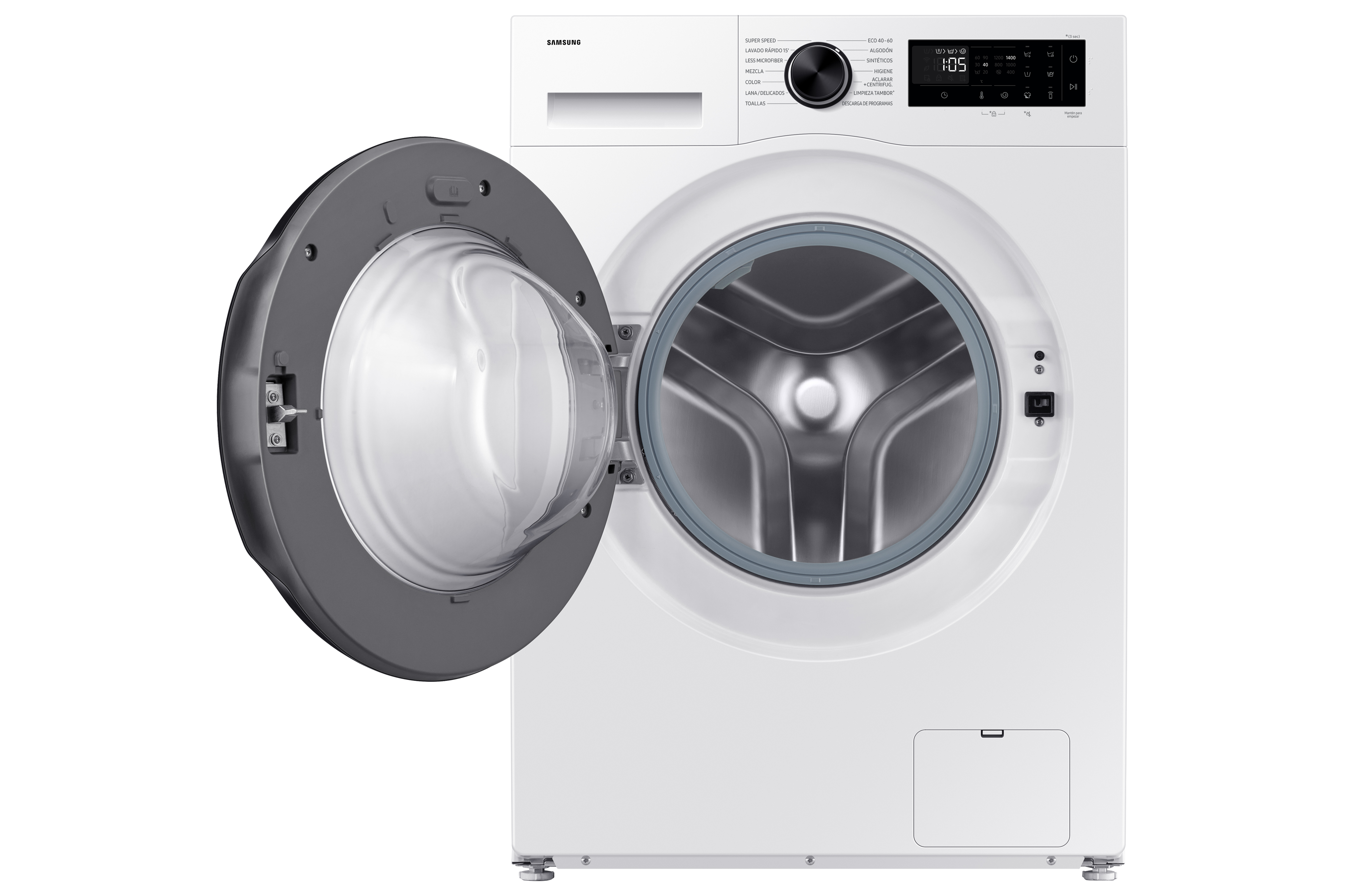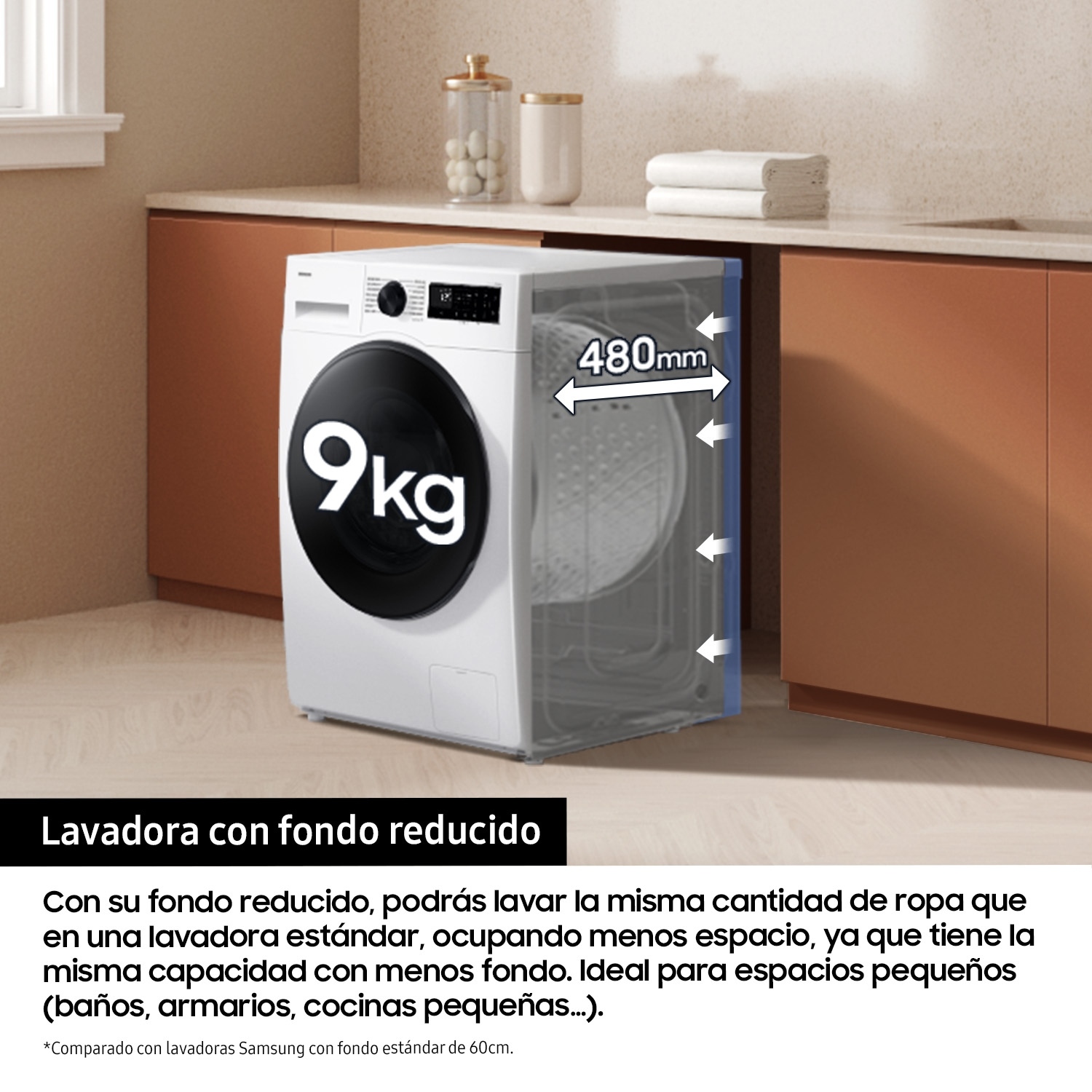 Samsung Lavadora con fondo reducido 9kg AI Ecobubble™ Clase A Blanca WW90DG5G34AEEC. Tipo de carga: Carga frontal. Capacidad nominal: 9 kg, Clase de secado por giro: B, Nivel de ruido (spin): 72 dB, Máxima velocidad de centrifugado: 1400 RPM. Color del producto: Blanco. Ancho: 600 mm, Profundidad: 480 mm, Altura: 850 mm. Clase de eficiencia de energía: A