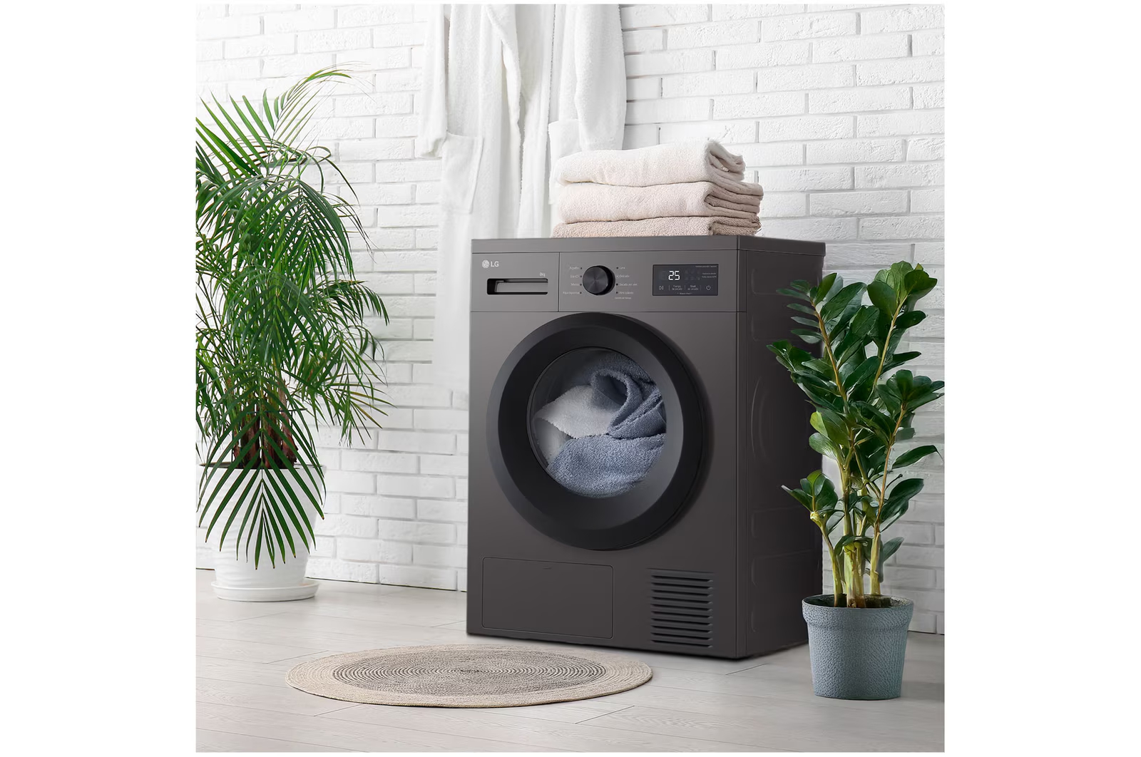 Secadora de condensación con bomba de calor que utiliza temperatura moderada para proteger la ropa del sobrecalentamiento. Dispone de ocho programas de secado: algodón, tejidos mixtos, eco, ropa de deporte, lana, delicado, secado en cesto, secado cálido y antiarrugas. Incorpora sensor de humedad para optimizar el secado y display LED con función de inicio diferido de 1 a 24 horas. Incluye tubo de desagüe. Funciona con alimentación de red eléctrica. Nivel de ruido durante el secado de 65 decibelios.