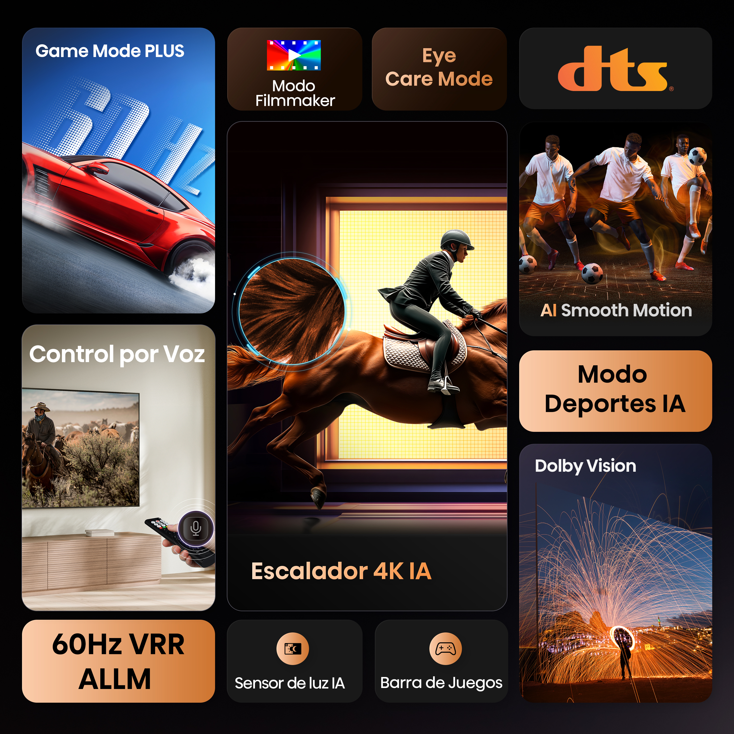 Escalador IA 4K: Esta función inteligente no solo transforma tus clásicos y películas caseras, sino también las emisiones de TV modernas, películas y hasta contenido en streaming en una impresionante calidad 4K. Smooth Motion IA: Experimenta imágenes fluidas y realistas con funciones avanzadas como MEMC y Reducción de Ruido 3D, integradas en un panel altamente sensible. Modo Juego Plus: Mejora tu experiencia de juego con el Modo Juego PLUS y una barra de juego como centro de control integrado. VRR y ALLM reducen el retraso de entrada y eliminan el desgarro de la pantalla. Control por voz: Con solo presionar un botón, activa los comandos de voz. Navega por los programas, ajusta el volumen o interactúa con asistentes virtuales sin esfuerzo. Dolby Vision: Dolby Vision es una tecnología HDR que ofrece una calidad de imagen superior a través de un mayor rango de colores y contraste, brindando una experiencia visual más inmersiva. DTS Virtual:X: Es una tecnología de procesamiento de audio que mejora la experiencia de sonido al proporcionar una mayor sensación de amplitud y dirección, creando una experiencia de audio envolvente sin la necesidad de altavoces adicionales.